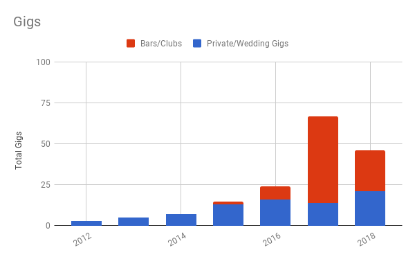 As you can see below, I’ve done fewer gigs and my revenue has grown. Bar gigs pull in $200-250 not including tax or expenses. My average weddings have been priced at $1500 depending on the package. This is exactly what I planned on.